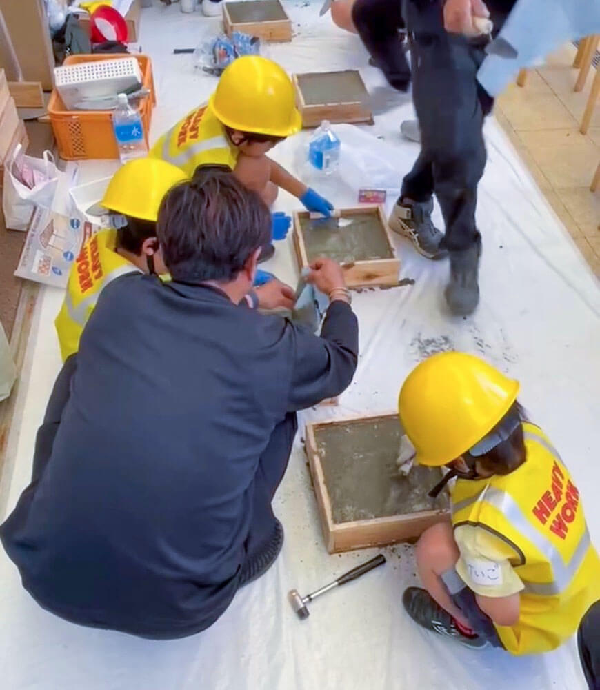 建物を造るのに必要な鉄筋を組み立てた後に、セメントや砂を混ぜあわせてつくった「モルタル」を型に流し込みます。